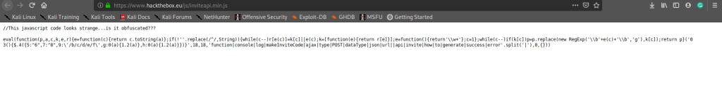 So now, go to https://www.hackthebox.eu/js/inviteapi.min.js . You will see a JS file like this: