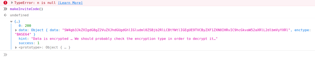 So, now you have made this far you will notice that there is a function named makeInvitecode which captures our interest. So, go to the console and type makeInviteCode() and press enter. you will find an encrypted message and when you click the small arrow alongside data, you’ll also find the encryption algorithm like this:
