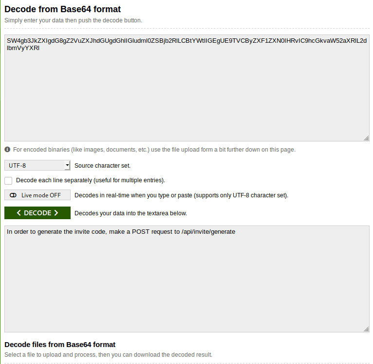 So, the decrypted message is “In order to generate the invite code, make a POST request to https:www.hackthebox.eu/api/invite/generate.