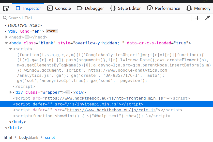 Now, go through the elements tab and you’ll find a script with the source as /js/inviteapi.min.js