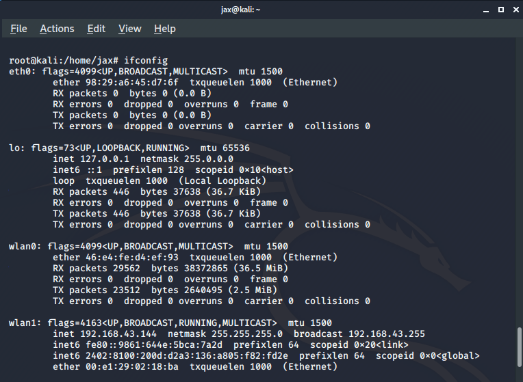 - Now check the name of the wireless adapter you will be using for this attack. Type the ifconfig command and hit enter.