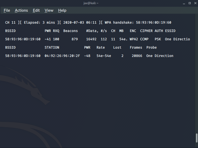 Now if you successfully get the WPA handshake, you’ll see a message on the top right. Also once you capture the handshake, you’ll now see the ESSID of the router also. So, we have the handshake and the name of the AP also. So now the only thing we need to do is match the handshake with the passwords in our wordlist.