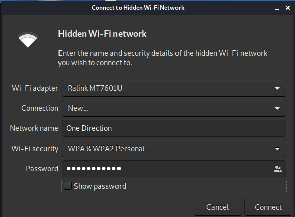 The success of this attack depend if you have the password in your wordlist. Anyways, if you found it, now you have the password and the name of the AP also. So, to connect go to connect to hidden network and enter the details and voila! You’ve successfully hacked the network.