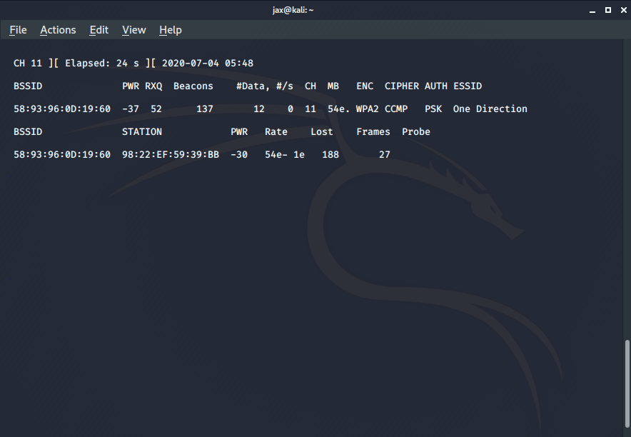 airodump-ng –bssid <bssid of the router> -c <channel number> -w <filename for handshake which we don’t need in case you have the password already> <interface name>