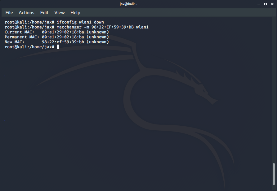 Now we use the macchanger tool to spoof our MAC address. So we use the following command: